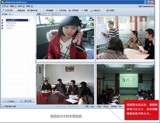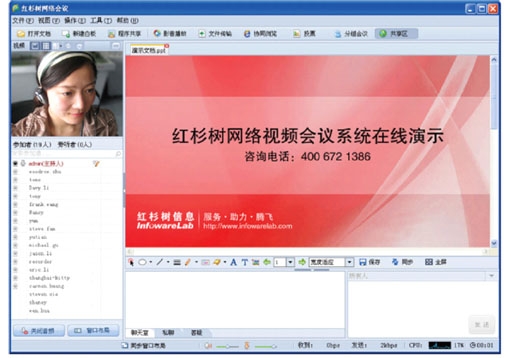 紅杉樹網(wǎng)絡(luò)視頻會議系統(tǒng)可實現(xiàn)諸如office、pdf、bmp等常用文檔、白板等的共享,可以實現(xiàn)影音播放、數(shù)據(jù)傳輸、協(xié)同瀏覽等功能,更能真正支持動態(tài)ppt,且H264的動態(tài)采集壓縮技術(shù)使得桌面和程序共享更高效,會議過程更生動,數(shù)據(jù)傳輸更豐富。